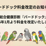 2026年1月4日 / 最終更新日 : 2026年1月4日 横浜小鳥の病院 BLOG バードドック料金改定のお知らせ いつも当院をご利用いただき、ありがとうございます。 愛鳥さんの健康を守るための「バードドック」に関する大切なお知らせがございます。 当院ではこれまで、できるだけ多くの方に定期検診を受けていただけるよう価格の維持に努めてま […]